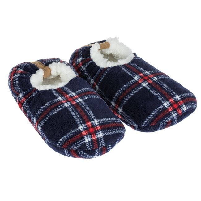 Botosei de iarna pentru barbati, parte exterioara moale de culoare albastra in carouri cu blana artificiala alba in interior si talpa antiderapanta cu pernite de silicon.
