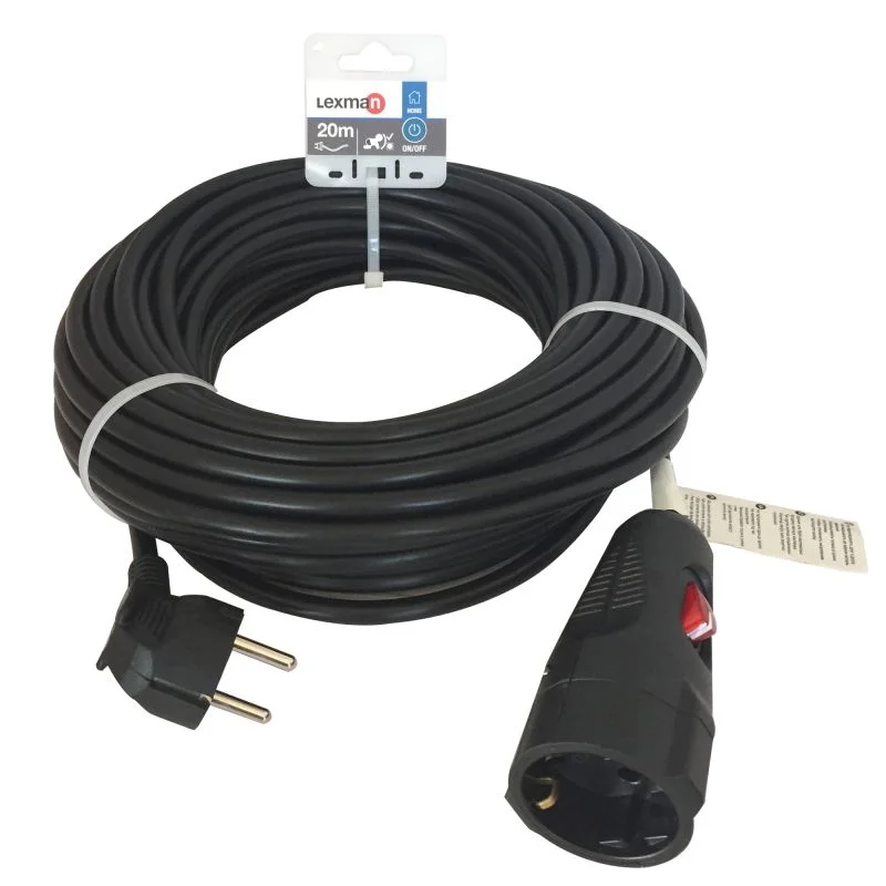 Cordon de cablu electric cu intrerupator Lexman de 20 m, tip HO5VV-F 3×1,5 mm² cu priza de 16 A si tensiune de intrare 230V. Este recomandat pentru alimentarea aparatelor de uz casnic in case si birouri.