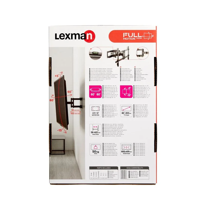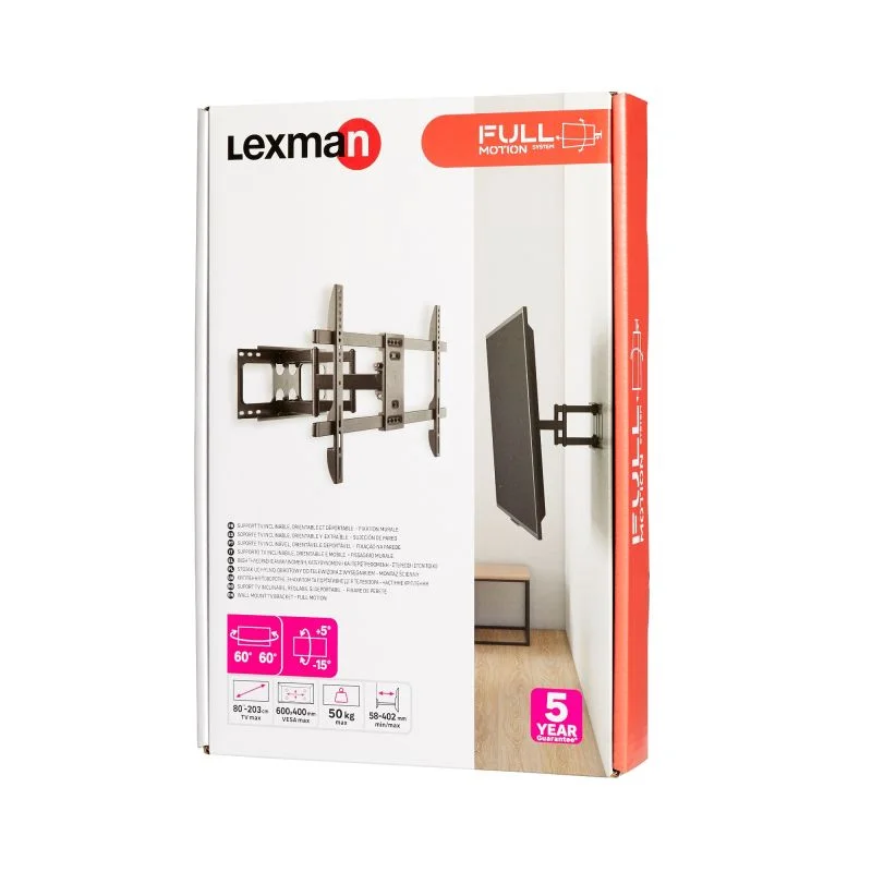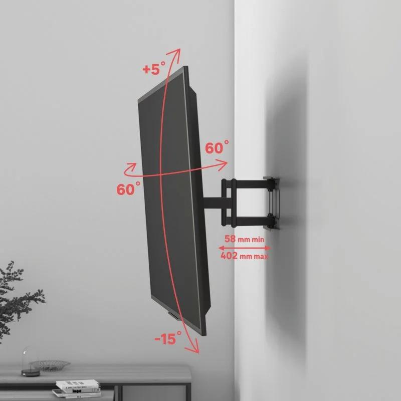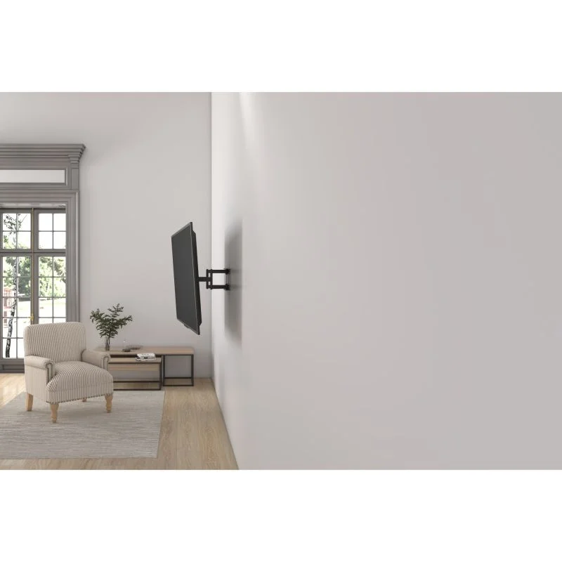 Designul mobil permite ajustarea poziției televizorului pentru un unghi de vizionare optim, reducând reflexiile și îmbunătățind confortul vizual. Construcția robustă asigură stabilitate și siguranță, iar montajul pe perete contribuie la economisirea spațiului și la un aspect modern al încăperii.